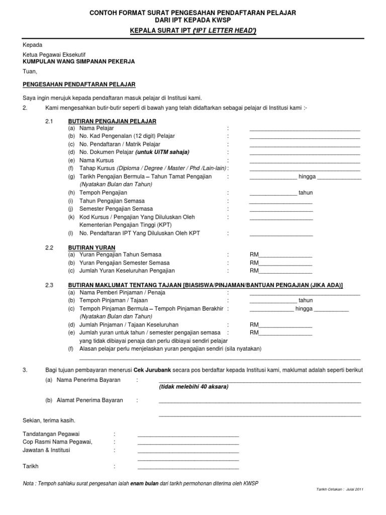 Contoh Surat Rasmi. Contoh Format Surat Pengesahan Pendaftaran Pelajar Dari IPT Kepada KWSP. Berminat menyambung pengajian di UniSZA.