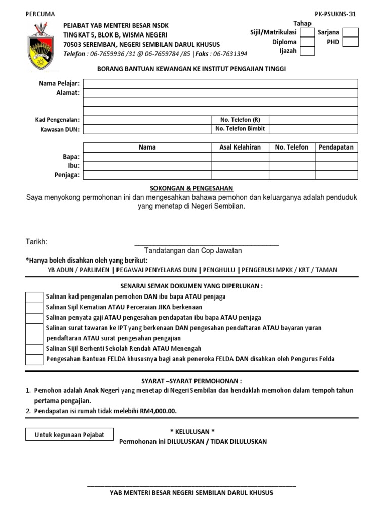 Borang Pengesahan Kelayakan Bantuan Pendidikan FELDA. Permohonan online e-consent adalah bagi hakmilik landed saja. Panduan buat pelajar lepasan Matrikulasi STPM dan Diploma yang berminat melanjutkan pengajian ke Universiti Sultan Zainal Abidin UniSZA ambilan 20202021.
